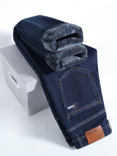 Men's Thickened Winter Fleece Jeans, Loose Straight Leg High Waist Casual Elastic Pants, Warm Long Denim Trousers for Fall & Winter