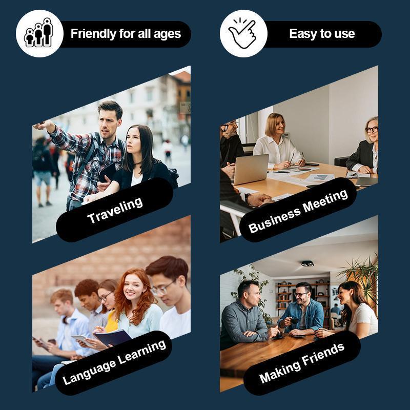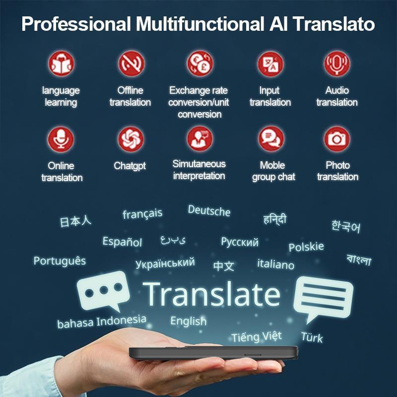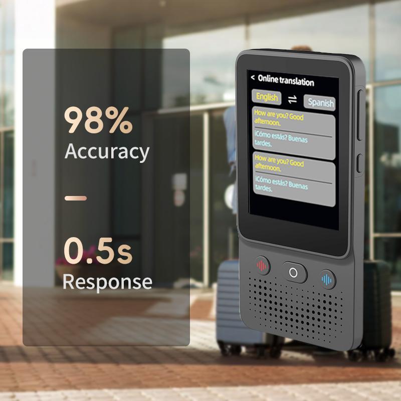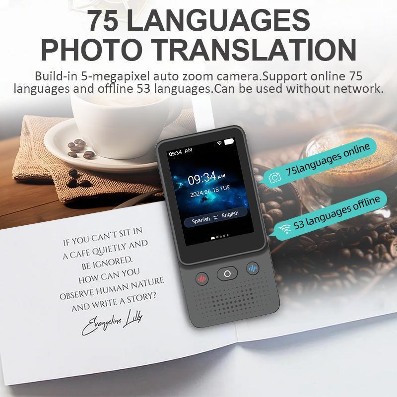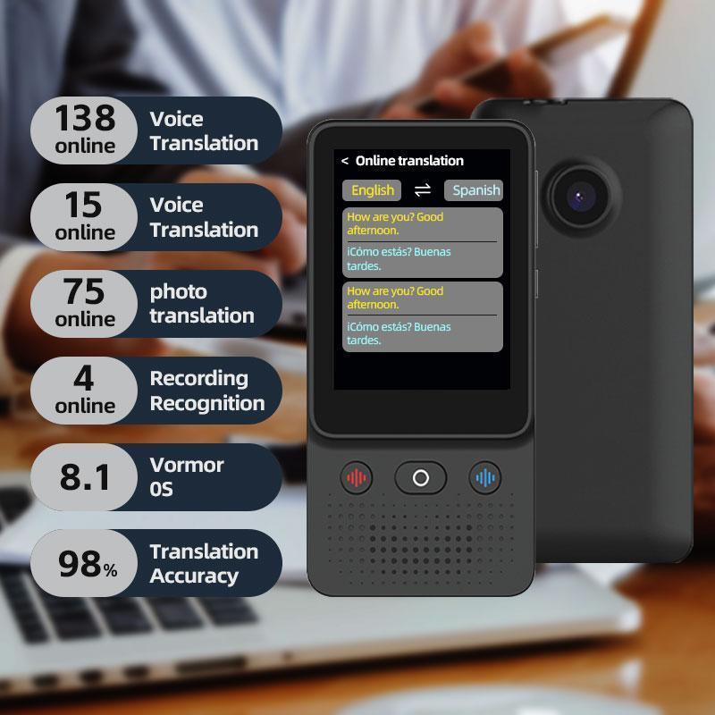 79.89Supports 138 Languages: Covers a wide range of languages including English, Spanish, Chinese, French, German, Japanese, and many more, ensuring effective communication in various countries and situations. Real-Time Bidirectional Translation: Experience smooth, real-time two-way translation, allowing for fluent conversations without interruptions. Perfect for meetings, travel, or casual exchanges. Offline Translation: Supports offline use without WiFi and cell phone connection, suitable for no network scenarios such as the countryside, weak signal, and in flight. High Recognition Accuracy: Equipped with advanced speech recognition technology, this translator boasts a high accuracy rate, ensuring reliable translations even in noisy environments or complex conversations. 1000mAh Rechargeable Lithium Battery: Powered by a long-lasting 1500mAh rechargeable lithium battery, this device provides up to 8 hours of continuous use on a single charge, ideal for long meetings, travel days, or study sessions. USB Charging: Convenient USB charging makes it easy to power up the device using any standard charger or power bank. Touchscreen Interface: Featuring a user-friendly touchscreen, making navigation and selection between languages and settings quick and intuitive. Photo Translation & Offline Mode: The device allows photo translation, where you can take pictures of text (menus, signs, documents) and have them translated instantly. It also supports offline translation by downloading language packs, making it perfect for remote areas with no internet access. Product Package Contents: Translation machine*1 Type-C data cable*1 Instructions*1 Packaging box*1