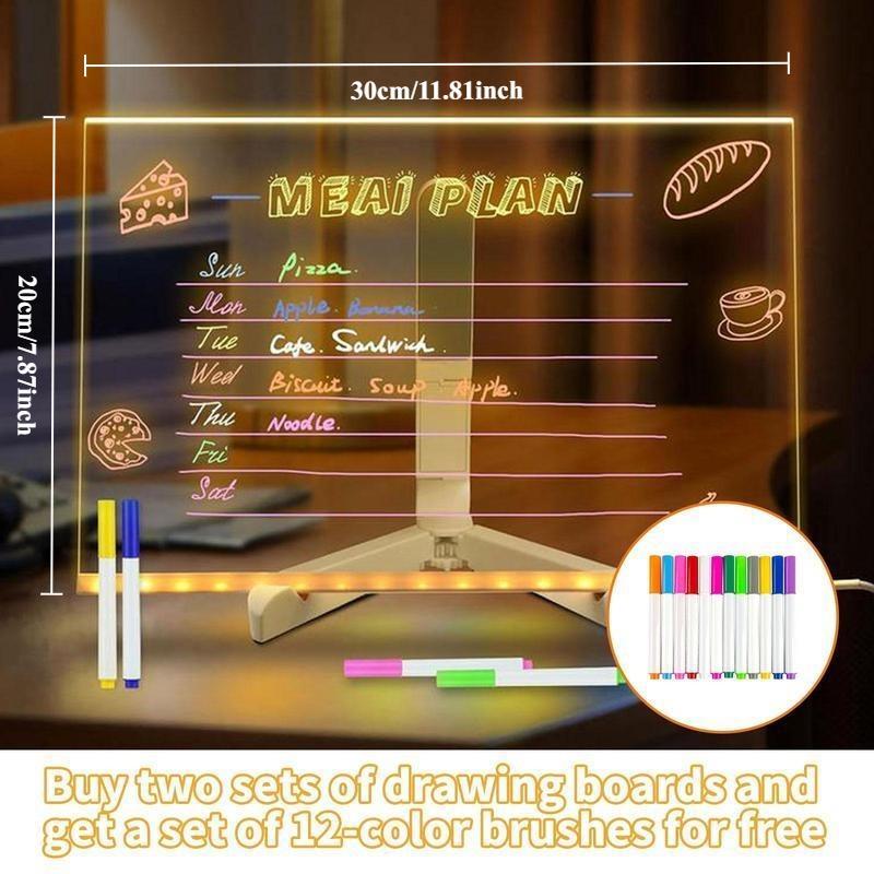1. [High-quality material] The soft luminous LED energy-saving lamp made of high-quality materials has superior high transparency and stronger light transmittance, and is not fragile. Please remove the protective film on both sides before use.Can be used as a message board, shopping list, to-do list, office board, daily menu plan, calendar, schedule, refrigerator organizer. 2. [Creative Night Light] The clear and warm light message board has your DIY design, which adds comfortable atmosphere lighting to the dim environment and instantly adds charm to the room. At the same time, you can use this soft light bulb to save energy. Since there is no dazzling white light, this beautiful rustic message board is also a great night light for children. 3. [Intimate Matching] We have equipped you with a bracket that can adjust the angle at will and a cloth that is easy to wipe the stylus, so that you can complete DIY projects with your children at will. Create beautiful announcements, elegant menus, and even fantastic to-dos to make housework more fun. Doodling freely will stimulate children's creativity. 4. [Wonderful Gift] It is suitable as a gift for any holiday and memorial day.Like Christmas gifts, New Year gifts, birthday gifts, Halloween gifts, Thanksgiving gifts and wedding anniversary surprises.It also can be the best toy for your baby kids. 5. [IQuality Assurance] We guarantee the unconditional replacement or refund of defective lamps.