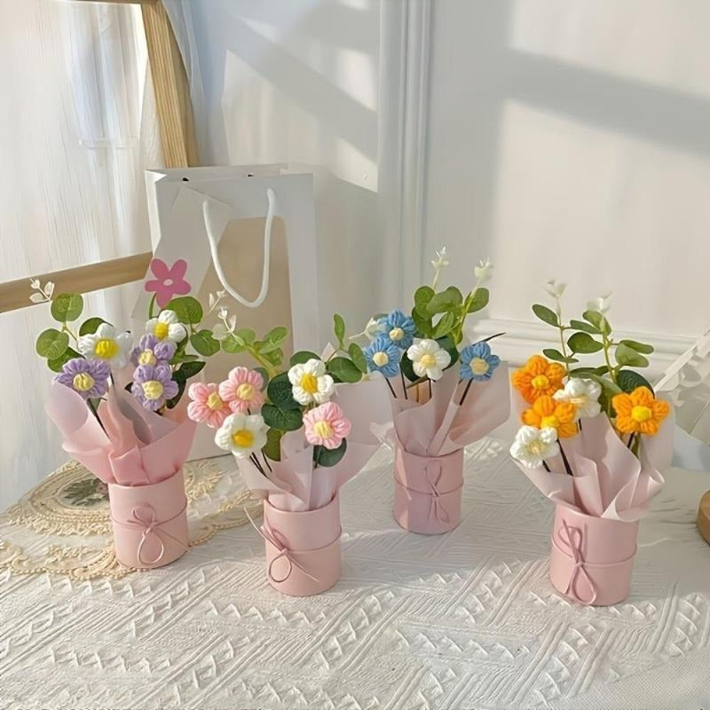 【Complete Gift Set】: Comes with a beautiful gift box and decorative ribbon, making it a perfect ready-to-give present for any occasion. 【Durable Materials】: Made from high-quality fabric and materials, this bouquet is designed to last, preserving its charm over time. 【Versatile Decor】: Ideal for multiple occasions like Mother's Day, anniversaries, or birthdays, adding a delightful touch to any setting. 【Colorful Presentation】: Includes 5 vibrant crochet flowers arranged in a pink vase, creating an eye-catching centerpiece for your home.