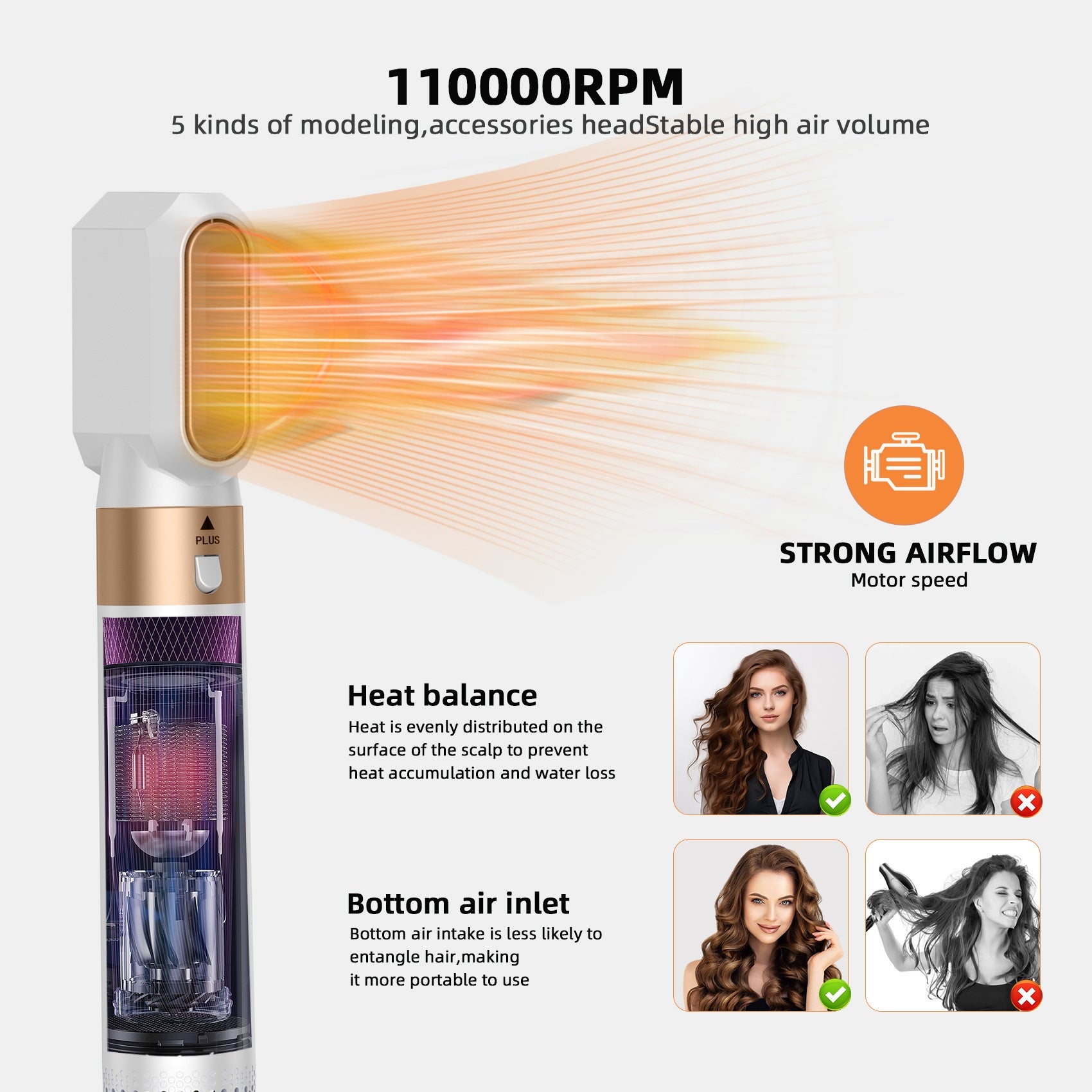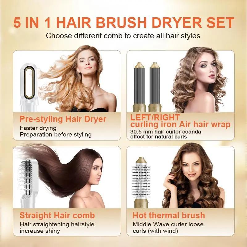 Perfect Gift for Girls! Hair Dryer 5 in 1 Hair Styler Set This set includes a hair dryer with millions of negative ions, auto hair curlers, and a detachable comb head. It's designed for auto curling, volumizing, and straightening.