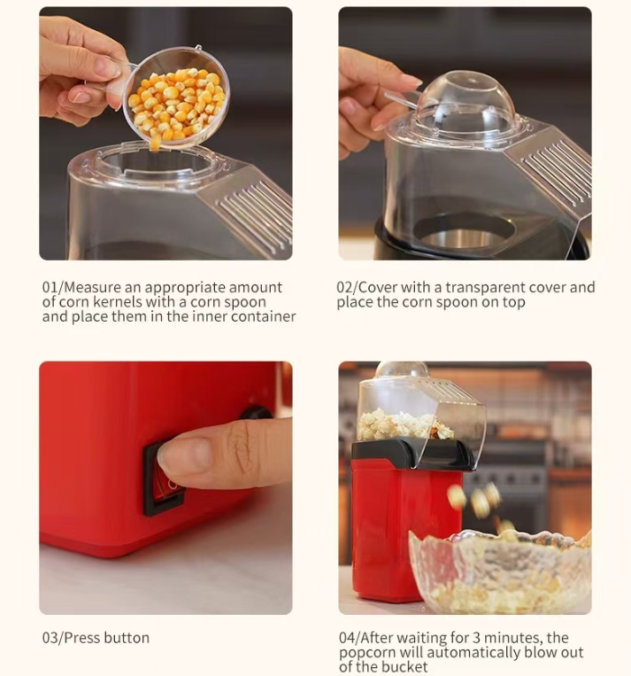 Efficient Performance: The 1200W power output ensures quick and efficient popcorn making. No Oil Needed: Enjoy guilt-free snacking with this electric popcorn maker that requires no oil. Easy Measurement: Comes with a measuring cup for precise portion control.